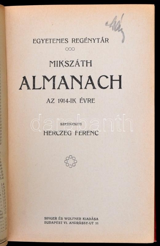 Egyetemes Regénytár. Mikszáth Almanach az 1914. évre. Szerk.: Herczeg Ferenc. Bp., 1914, Singer és Wolfner. Kiadói aranyozott, festett, illusztrált zöld egészvászon, Gottermayer-féle kötés, márványozott lapélekkel, kissé kopott borítóval.