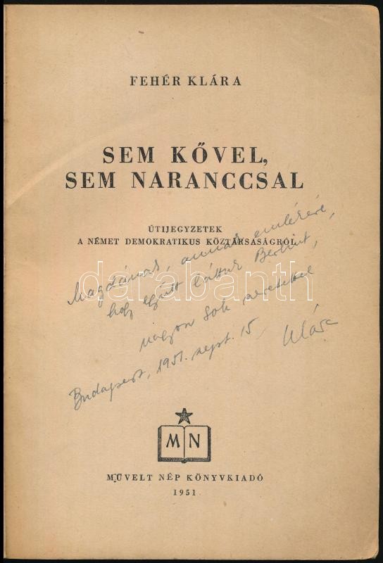 Description: Fehér Klára: Sem kővel, sem naranccsal. Útijegyzetek a Német Demokratikus Köztársaságról. Bp.,1951, Művelt Nép. Kiadói papírkötés. A szerző által dedikált.