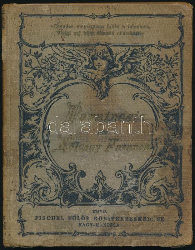 Kölcsey Ferenc: Parainesis. Nagykanizsa,[1896], Fischel Fülöp, 71 p. Kiadói festett egészvászon-kötés, megviselt állapotban, a címlap és a 3. oldal között kissé sérült kötéssel, ceruzás aláhúzásokkal, 43-44. és 45-46. oldalaknál a lapok sérültek, az elülső szennylap belsején ajándékozási sorokkal.