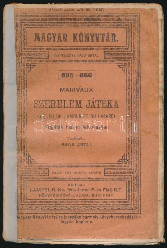 Description: Marivaux: Szerelem játéka. (Le Jeu De L'Amour et du Hasard.) Végjáték három felvonásban. Fordította: Radó Antal. Magyar Könyvtár 885-886. Bp.,(1918), Lampel R. (Wodianer F. és Fiai) Rt., 78 p. Kiadói papírkötés, szakadt borítóval, javított gerinccel, foltos lapszélekkel.