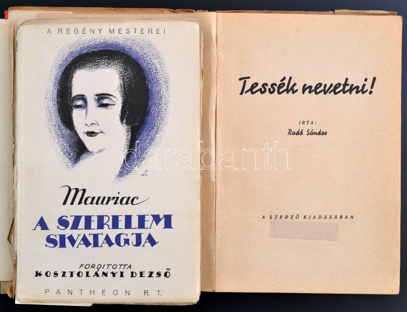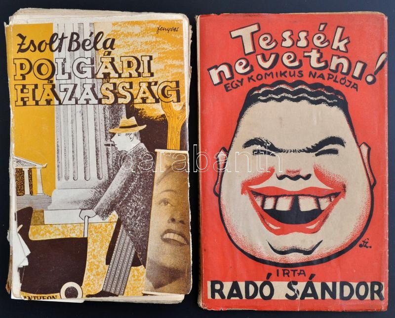 Radó Sándor: Tessék nevetni! Egy komikus naplója. Kispest,[1942], Faragó Imre-ny., 94 p. Szerzői kiadás. Kiadói illusztrált papírkötés, a könyvtest szétvált és elvált a borítótól. Első kiadás. A szerző által aláírt. + Zsolt Béla: Polgári házasság. Bp.,é.n., Pantheon. Kiadói papírkötés, szakadt borítóval, kijáró lapokkal.