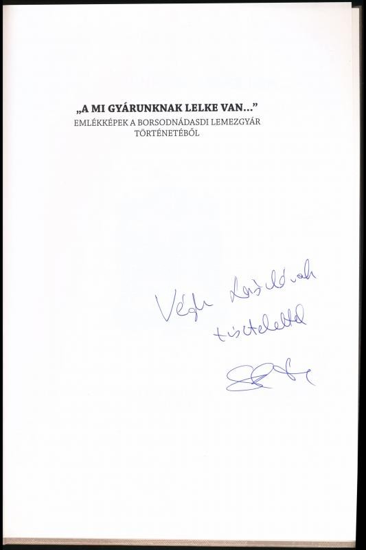 Sági Gábor: "A mi gyárunknak lelke van..." Emlékképek a Bors... https://www.darabanth.com/en/342-Online-auction/342.0/Books/Books-Other-rarities~1000019/Sagi-Gabor-A-mi-gyarunknak-lelke-van-Emlekkepek-a-Borsodnadasdi-Lemezgyar-torteneteb~II1928581