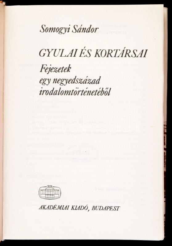 Somogyi Sándor: Gyulai és kortársai. Fejezetek egy negyedszázad irodalomtörténetéből. Bp.,1977,Akadémiai Kiadó. Kiadói egészvászon-kötés, kiadói papír védőborítóban, intézményi bélyegzővel.