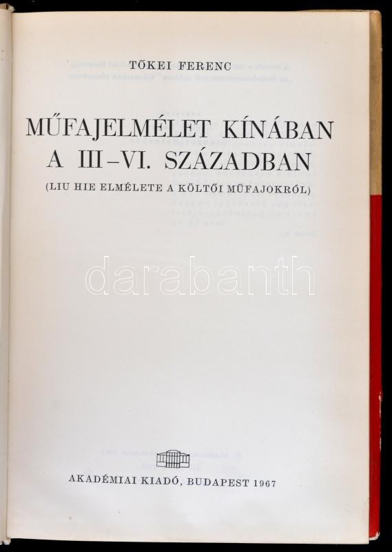 TÅ‘kei Ferenc: Műfajelmélet KÃnában a III-VI. században (Liu Hie elmélete a költÅ‘i műfajokról). Bp., 1967, Akadémiai, megjelent 500 példányban. Kiadói egészvászon kötés, papÃr védÅ‘borÃtóval, kissé kopottas állapotban.