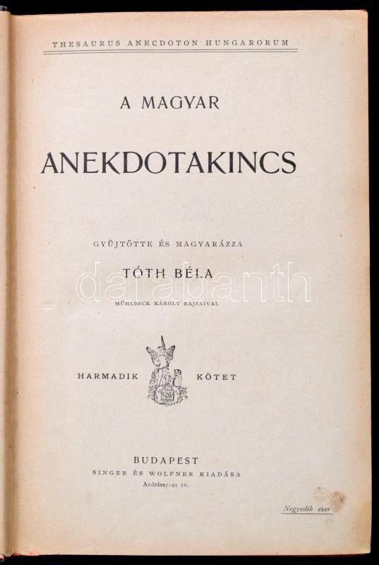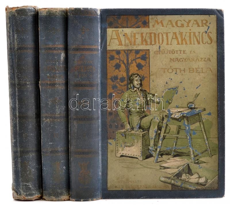 Tóth Béla: A magyar anekdotakincs. I-III. kötet. Theasaurus Anecdoton Hungarorum. Mühlbeck Károly rajzaival. Bp.,é.n., Singer és Wolfner, 398+381+399 p. Kiadói aranyozott, festett, illusztrált egészvászon-kötés, festett lapélekkel, kopott borítóval és gerinccel, II. és III. kötet gerincein kis sérüléssel.