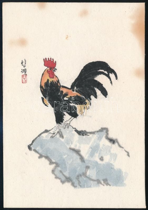 Miniatűr kínai fametszet. Színezett. Xu Beihong - Kakas. / Chinese woodblock 18,3x12,6 cm