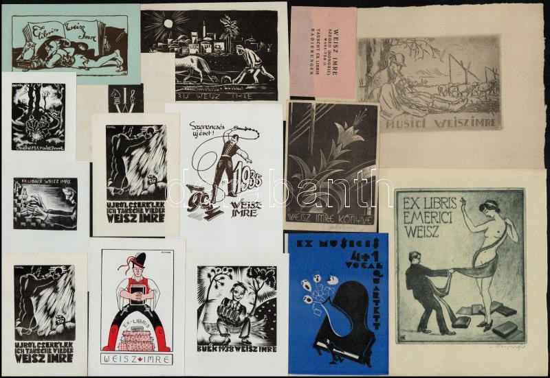 Weisz Imre (?) ex libris gyűjteményéből, különféle ex librisek, fametszet, klisé, papír, különböző méretben