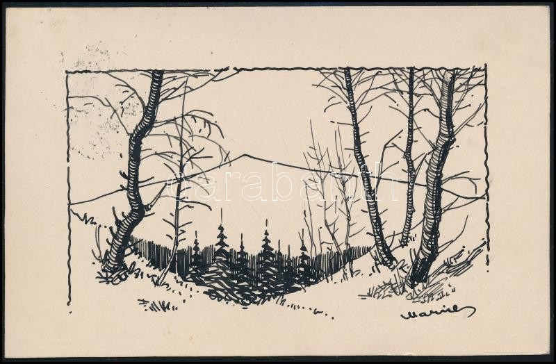 Marich Géza Gordon (1913-1985): Táj. Tus, papír. Kézzel festett képslap, saját kézzel megírt sorokkal. 9x14 cm. Kanadában élt magyar festő-