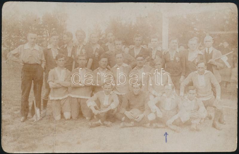1919 Környei futball csapat, Környe-Tata 2:0, fotólap Willner Jenő fényképészetéből, pecséttel jelzett, 8,5×13,5 cm