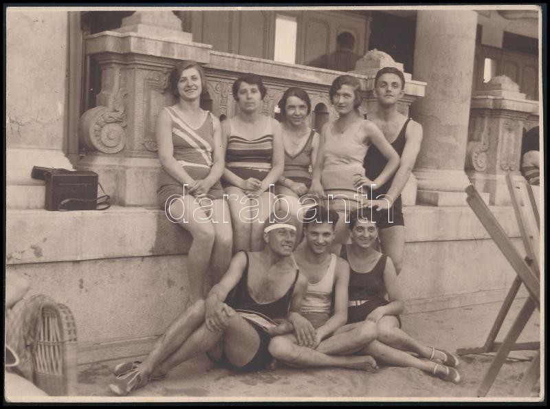 1930 Strandozók a Széchényi fürdőben, fotó, a hátoldalon feliratozva, ...