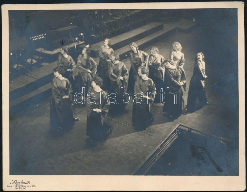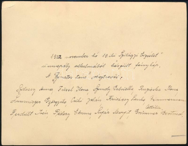 1932 A Szilágyi Erzsébet ünnepélyen előadott "Bánatos tánc" résztvevői, csoportkép Rosbaud budapesti műterméből, hátulján a fellépők névsorával (Szilassy Anna, Füssl Ilona, Ruzicska Ilona, Perdült Irén, stb.), 12,5×16 cm