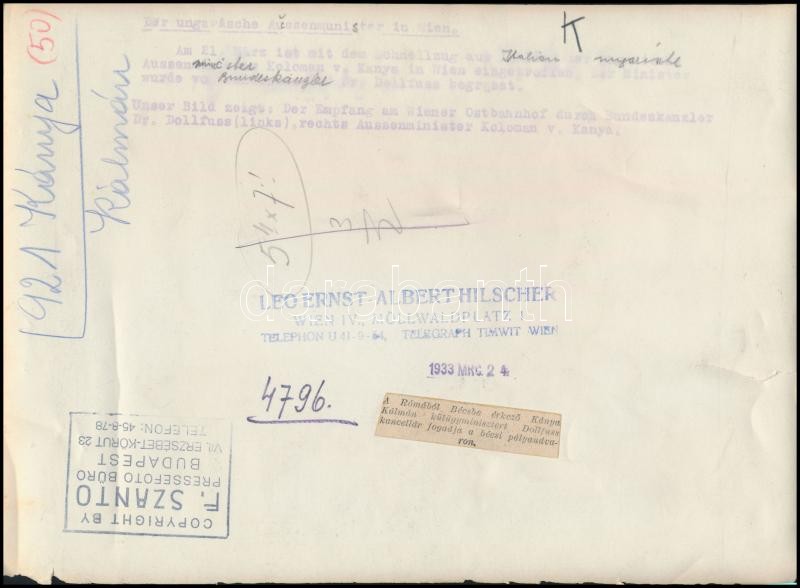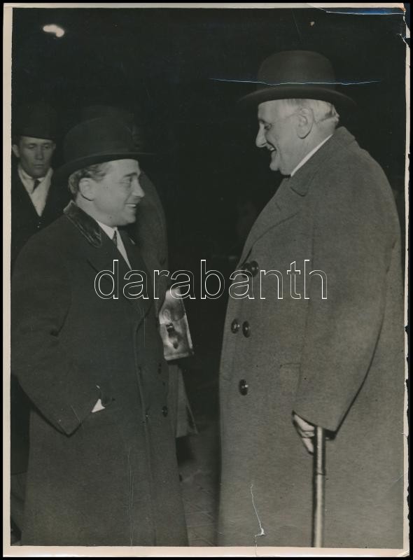 Description: 1933 Kánya Kálmán (1869-1945) politikus, külügyminiszter és Engelbert Dollfuß (1892-1934) osztrák kancellár találkozása, több nyelven feliratozott sajtófotó, szakadással, törésnyomokkal, 24×17 cm