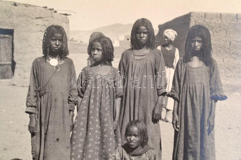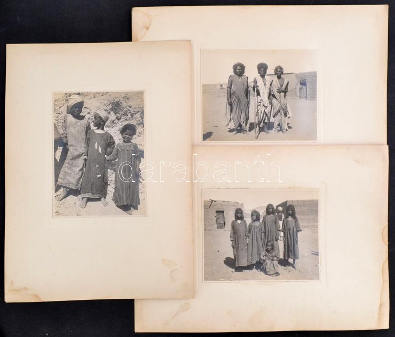 1935 Egyiptom, Asszuán. A bishari törzs tagjai, 3 db fotó kartonon, kettő hátoldalán feliratozva, a kartonon folttal, 17x12 cm és 12x15 cm közötti méretben/ 1935 Egypt, Assuan. The members of the tribe of Bishari, 3 pieces of photo on board, with writings on the back, with spotties on the board, between 17x12 cm and 12x15 cm