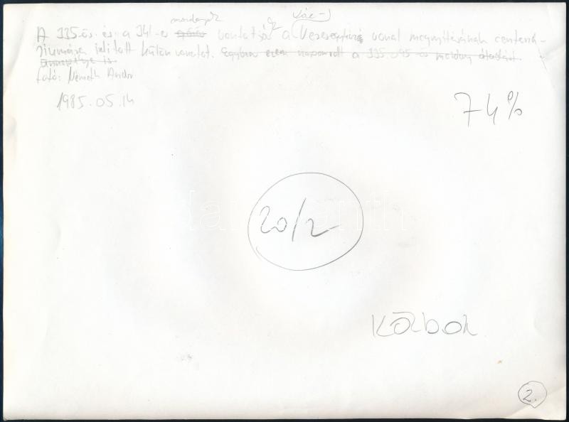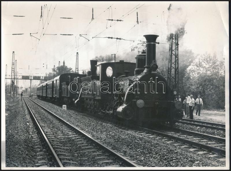 Description: 1985 MÁV 335-ös és 341-es mozdonyok vontatják a Vác-Veresegyház vonal megnyitásának centenáriumára indított különvonat, feliratozott sajtófotó, felületén törésnyomokkal, 17,5×23,5 cm
