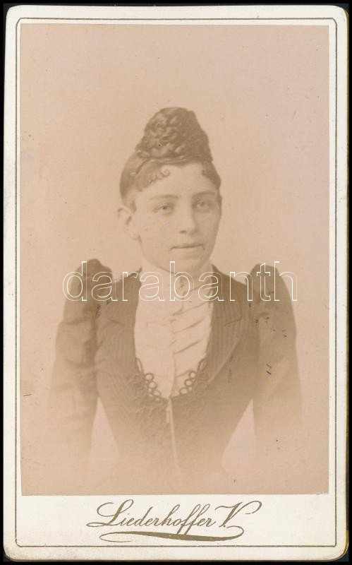 cca 1880 Hölgy műtermi portréja, keményhátú fotó Liederhoffer Vilmos budapesti műterméből, 11×6,5 cm