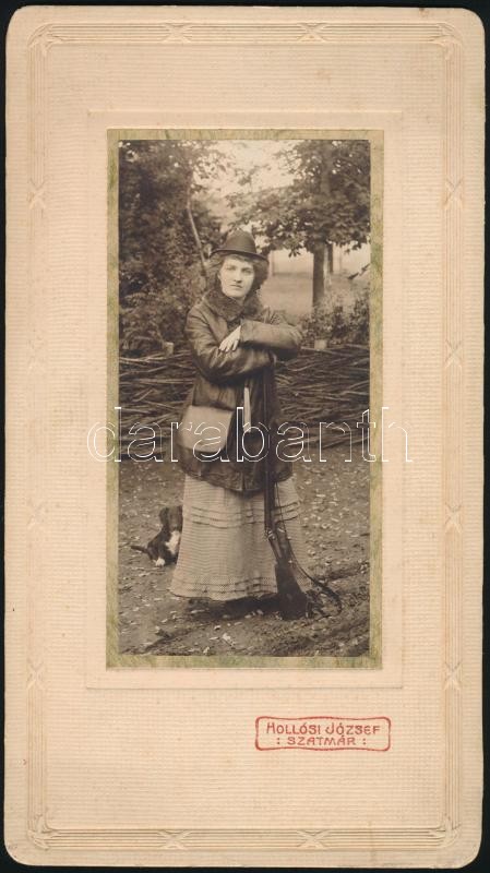 cca 1900 Vadászó nő, fotó kartonra ragasztva, Hollósi József szatmári ...