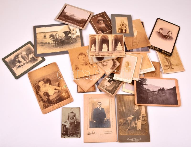 cca 1900 Vegyes keményhátú fotó tétel, műtermi portrék, életképek, csoportképek, egy katonai fotó, 30 db, vegyes méretben
