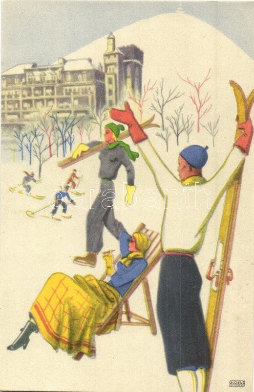 Budapesti Svábhegy Szanatórium Klimatikus Diétás Gyógyintézetének reklámlapja síelőkkel, téli sport. Globus / Hungarian sanatorium advertisement, skiers, winter sport