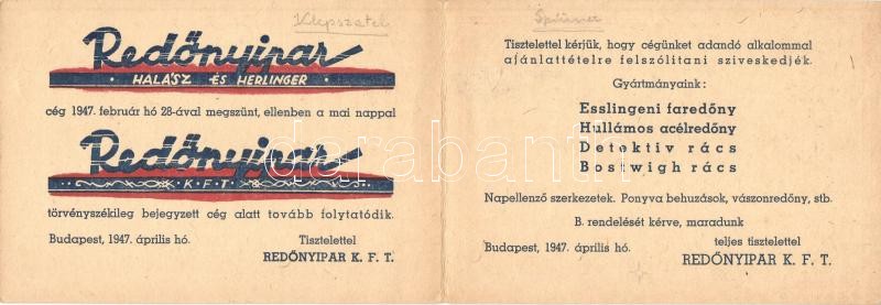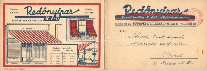 Redőnyipar Kft. kihajtható reklámlapja. Budapest VII. Király utca 27. / Hungarian shutter company's foldable advertisement card (EK)