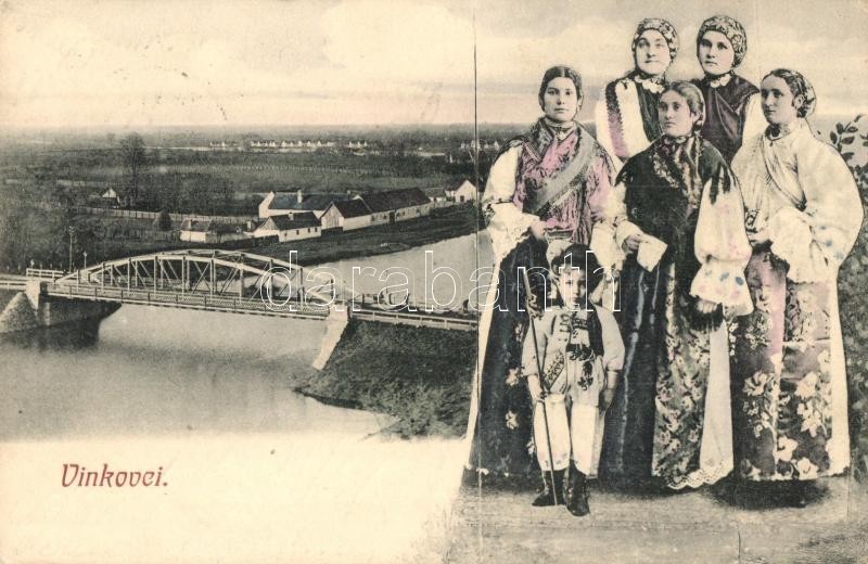 Vinkovce, Vinkovci; látkép híddal, szlavóniai népviselet, folklór. Kia...