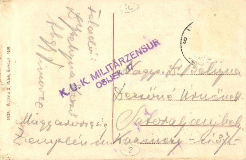 Vinkovce, Vinkovci; látkép híddal, szlavóniai népviselet, folklór. Kiadja J. Reich / general view with bridge, Slavonian folklore, traditional costumes + K.u.K. Militärzensur Osijek 17