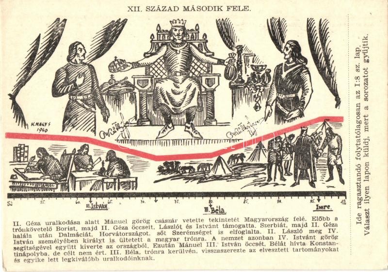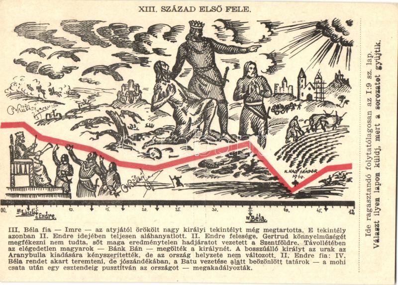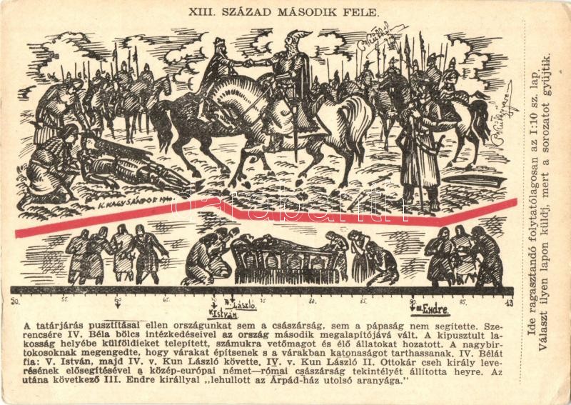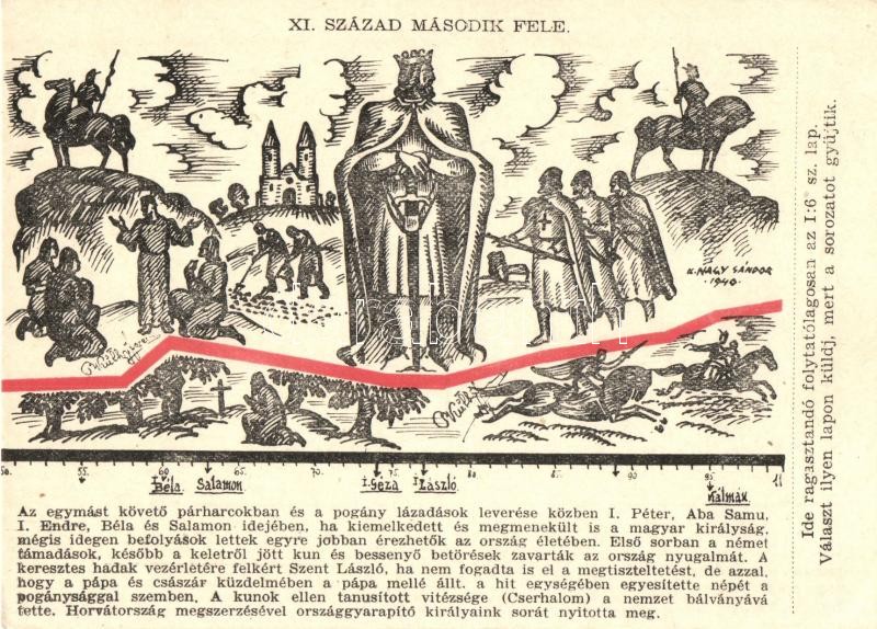 11 db képeslap a "A Magyar Sors - bajtársi levelezés" I. sz. (hadtörténeti) 22 darabos képeslapsorozatból; Szerk. Kuthy Ferenc. K. Nagy Sándor rajzaival- kiadja a Magyar Nemzeti Szövetség / 11 pre-1945 Hungarian military history art postcards from a serie