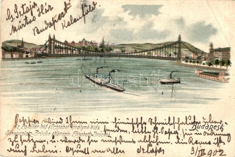 1902 Budapest, Eskü téri híd (Erzsébet királyné híd), gőzhajók. litho (EB)