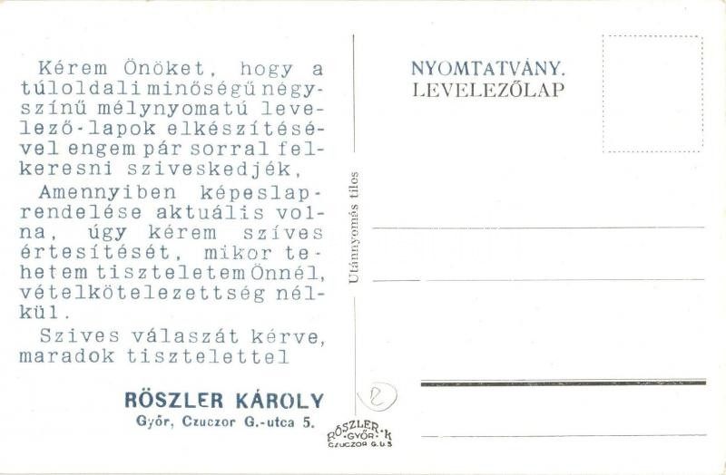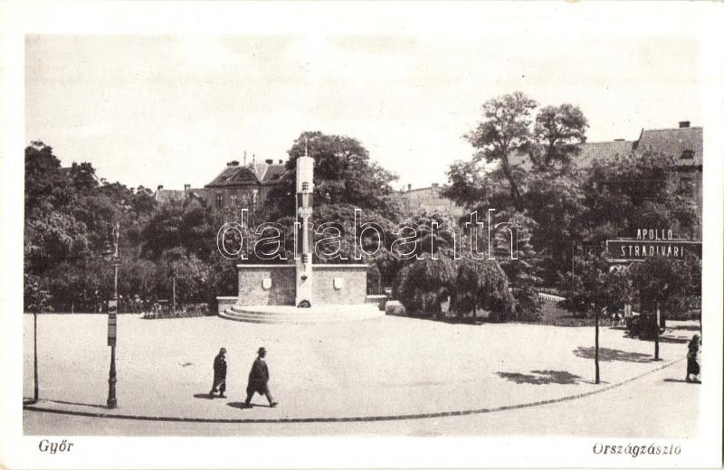 Győr, Országzsázló, Apollo mozi "Stradivári" film reklámjával. Hátoldalon üzenet a kiadótól, Röszler Károlytól