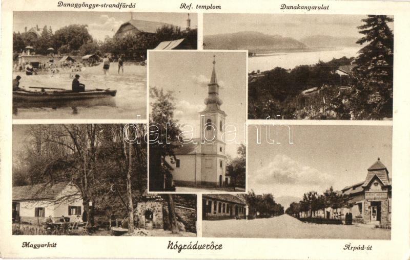 Verőce, Nógrádverőce; Dunagyöngye strandfürdő, Református templom, Dunakanyar, Magyarkút, Árpád út, Berényi András üzlete és saját kiadása (EK)
