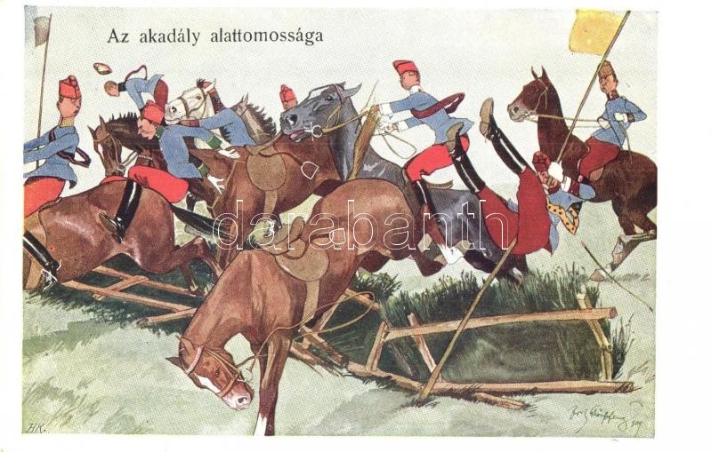 Az akadály alattomossága / Austro-Hungarian K.u.K. military officers art postcard. B.K.W.I. 879-1. s: Schönpflug