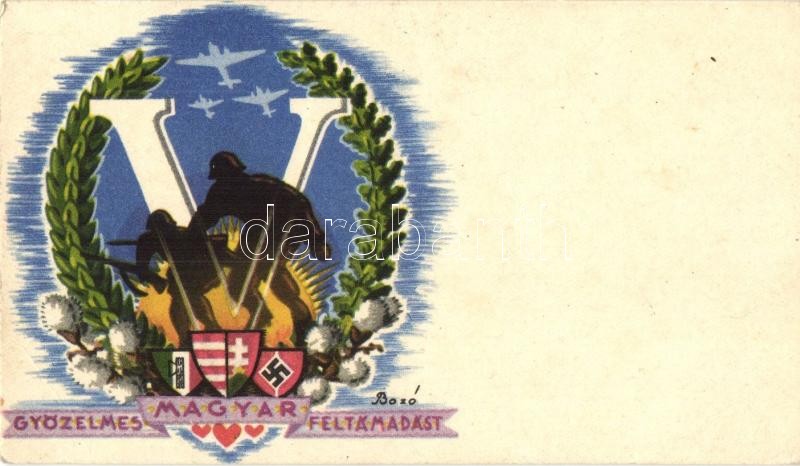 Győzelmes magyar feltámadást! / WWII Hungarian irredenta propaganda with swastika, mini greeting card (12 cm x 7 cm) s: Bozó (non PC)