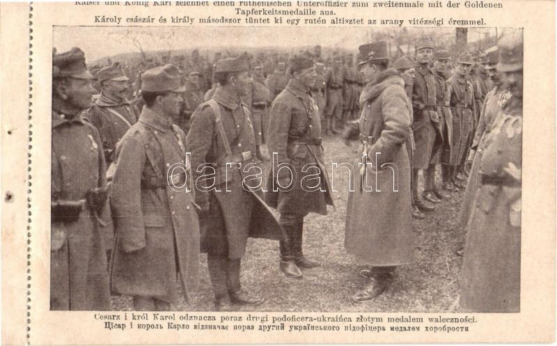 Kaiser und König Karl zeichnet einen ruthenischen Unteroffizier zum zweitenmale mit der Goldenen Tapferkeitsmedaille aus / Károly császár és király másodszor tüntet ki egy rutén (ruszin) altisztet az arany vitézségi éremmel / WWI Charles I of Austria awards a Ruthene (Rusyn) non-commissioned K.u.K. officer for the second time with the Golden Medal for Bravery - képeslapfüzetből / from postcard booklet (perforált / perforated)
