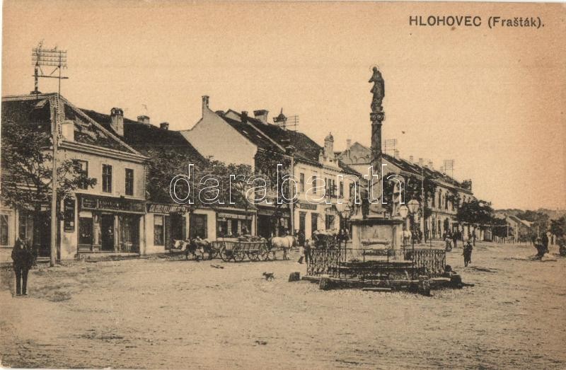 Galgóc, Frasták, Hlohovec; Fő tér, Szentháromság szobor, Galgóczi Villamostelep irodája, Neufeld üzlete, Gyógyszertár. Kiadja S. Bródy / main square, Trinity statue, electric power plant's office, shops, pharmacy