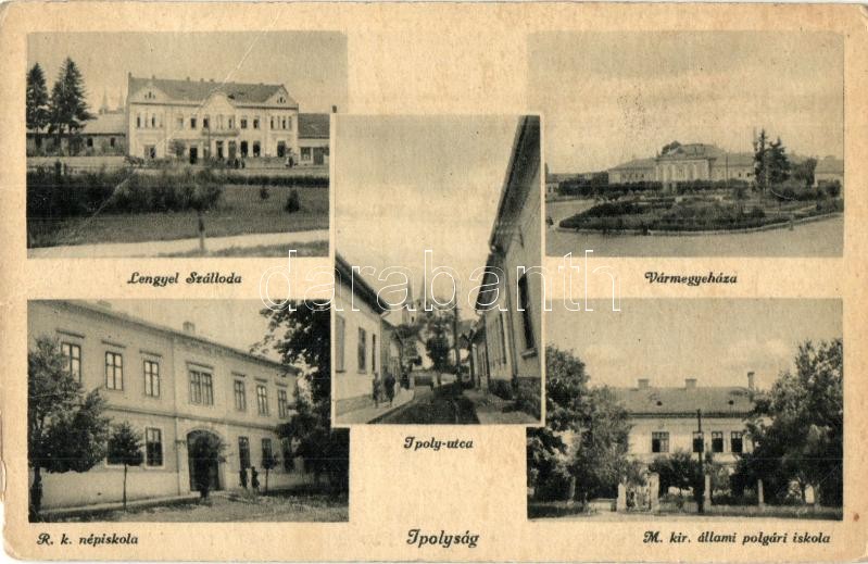 Ipolyság, Sahy; Lengyel szálloda, Ipoly utca, Vármegyeháza, Római katolikus iskola, M. kir. állami polgári iskola. Kiadja Pivarcs Anna / hotel, street view, county hall, Catholic school, state school (EB)