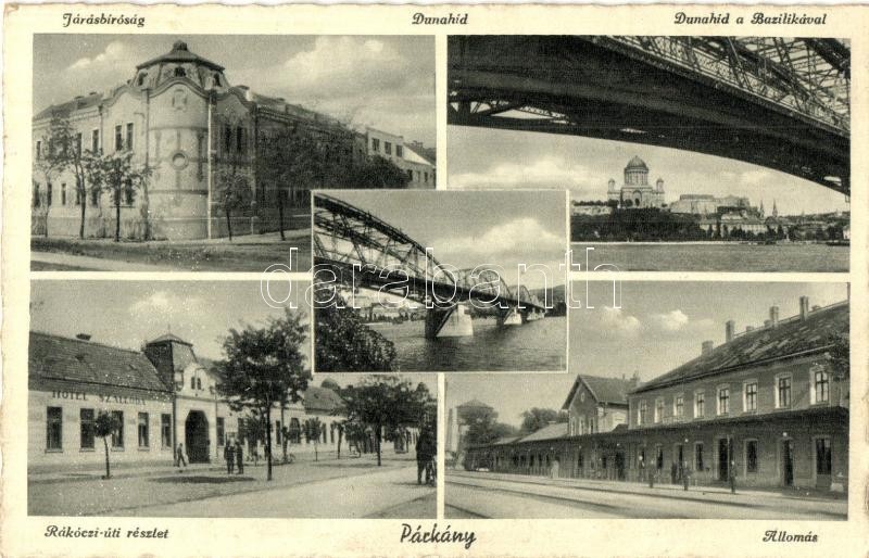 Párkány, Stúrovo; Járásbíróság, Duna híd a Bazilikával, Rákóczi út, szálloda, vasútállomás / district court, Danube bridge with Basilica (in Esztergom), street view, hotel, railway station