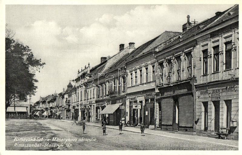 Rimaszombat, Rimavská Sobota; Masarykovo námestie / Masaryk tér, Altmann Sámuel, Bata, Csordás, Dickmann, Róth Géza üzlete, kávéház és étterem / square, shops, café, restaurant