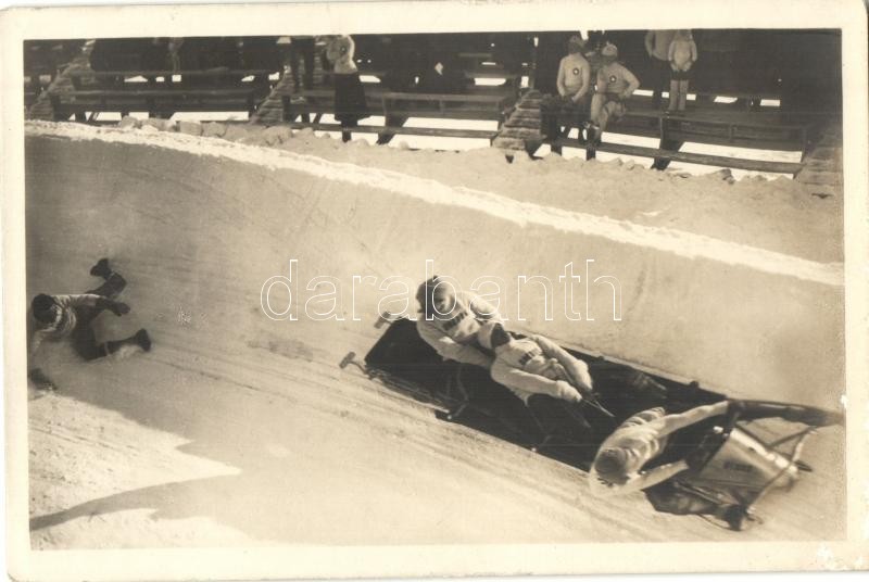 Description: Bobschlitten, Bob verliert seinen Bremser auf Strecke in Kurve, Wintersport / Téli sport, 4 személyes kormányozható bob elhagyja a fékért felelős tagot egy éles kanyarban / winter sport, sledding, 4-men controllable bobsled, bobsleigh, bob loses the brakeman in a sharp curve. H. Wieck Serie VI. 2. (EK)