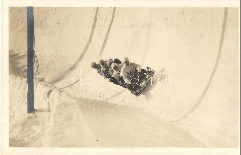 Bobsleigh die grosse Kurve passierend. Bobschlitten, Wintersport / Téli sport, 5 személyes kormányozható bob, szánkózók / winter sport, sledding, 5-men controllable bobsled. Wehrli A.-G. 29389. (EK)