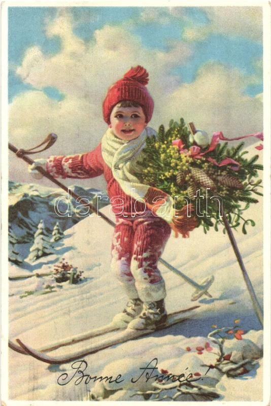 Bonne Anné / New Year greeting art postcard with child skiing
