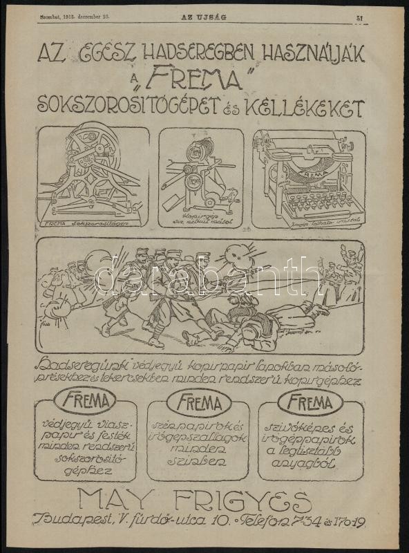 https://www.darabanth.com/en/343-Online-auction/343.0/Art-and-other-collectibles/Advertisement~500022/1915-Doczi-Mor-Magyarorszag-legnagyobb-cipoaruhaza-May-Frigyes-Frema-sokszorosito-gep~II1933253