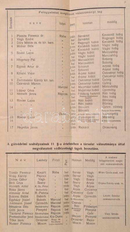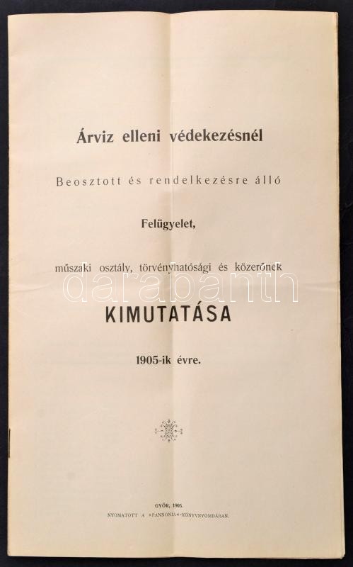 1905 Győr, Árvíz elleni védekezésnél beosztott és rendelkezésre álló felügyelet, műszaki osztály, törvényhatósági és közerőnek kimutatása 1905-ik évre. Győr, 1905, Pannónia Könyvnyomda, 15 p.