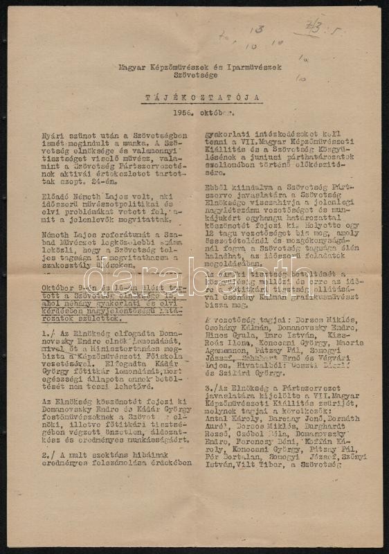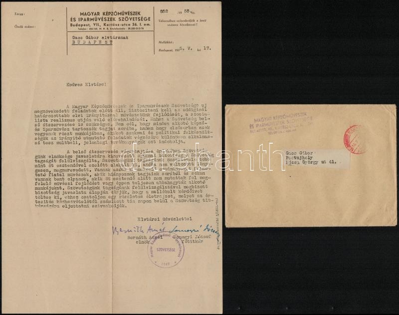 1955-1956 Magyar Képzőművészek és Iparművészek Szövetségének gépelt levele Gacs Gábor (1930-) grafikusművész részére, benne a szövetség átszervezésére vonatkozó információkkal, Bernáth (1895-1982) alelnök, festőművész, grafikus, művészet író és Somogyi József (1916-1993) szobrászművész, később főiskolai tanár és a Képzőművészeti Főiskola rektora aláírásaival. +Magyar Képzőművészek és Iparművészek Szövetségének gépelt tájékoztatója Gacs Gábor (1930-) grafikusművész részére, benne a vezetőség leváltásának és átszervezésének hírével a "múlt szektáns hibáinak eredményes felszámolása érdekében." Benne számos nagy nevű művésszel (Borsos Miklós, Hincz Gyula, Csohány Kálmán, Reich Károly...stb.)