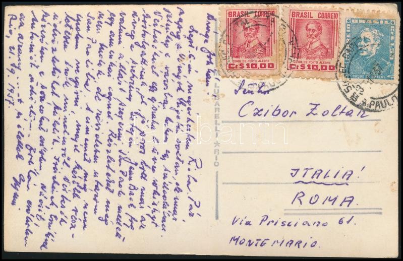 1957 Czibor Zoltán magyar labdarúgónak írt képeslap disszidálása után, ismeretlentől Rióból