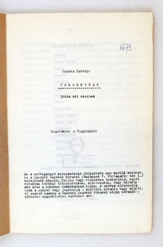 Csurka István: Versenynap - Dráma két részben, cca 1980, Szerzői Jogvédő Hivatal - Színházi Osztály. Kiadatlan szövegkönyv. Papírkötésben, írógéppel lejegyezve. Jó állapotban.