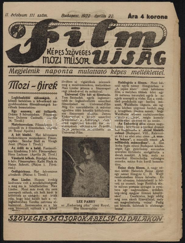 1922 Bp., A Filmújság, képes szöveges mozi műsor II. évfolyamának 111....