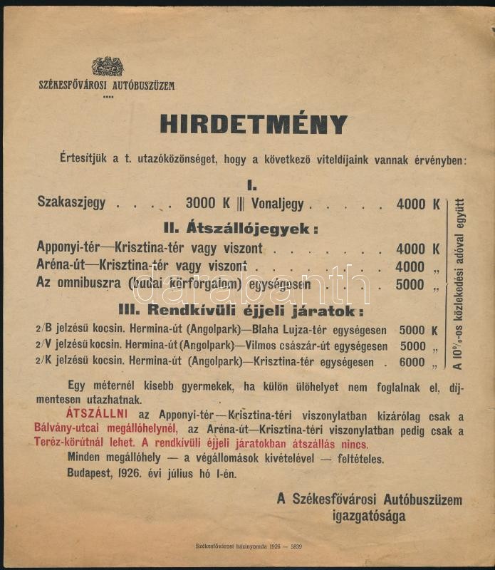1926 Bp., Székesfővárosi Autóbuszüzem hirdetménye átszállójegyekről és rendkívüli éjjeli járatokról