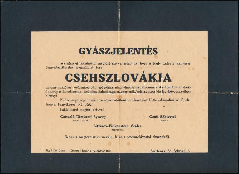 1938 Csehszlovákiát temető szarkasztikus gyászjelentés a bécsi döntés ...