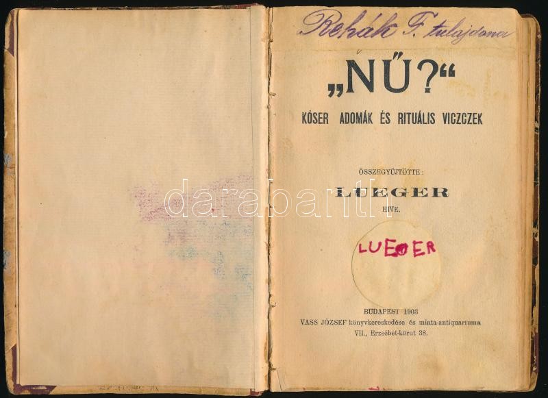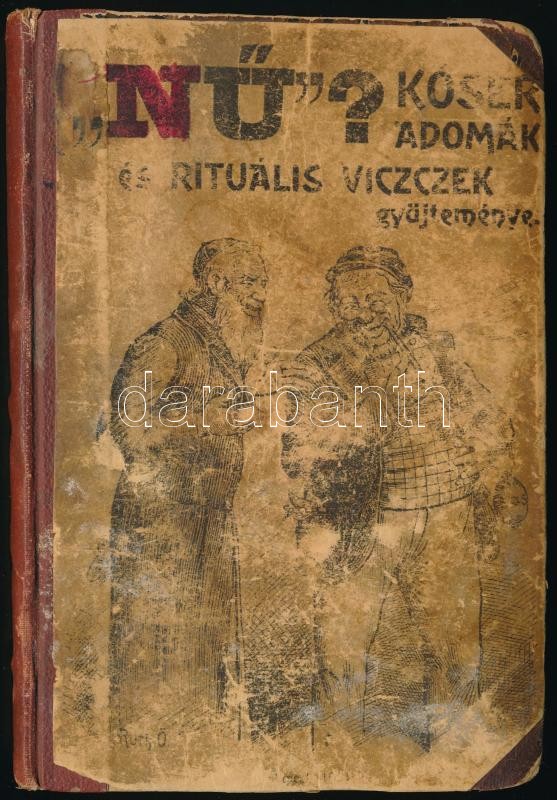"Nű?" Kóser adomák és rituális viccek. Összegyűjtötte: Lueger. Bp., 1903, Vass József, 94 p. Későbbi átkötött félvászon-kötés, kopott borítóval, az elülső kötéstábla belsején és előzéklapon rajzzal, laza fűzéssel, kissé foltos lapokkal, névbejegyzéssel.