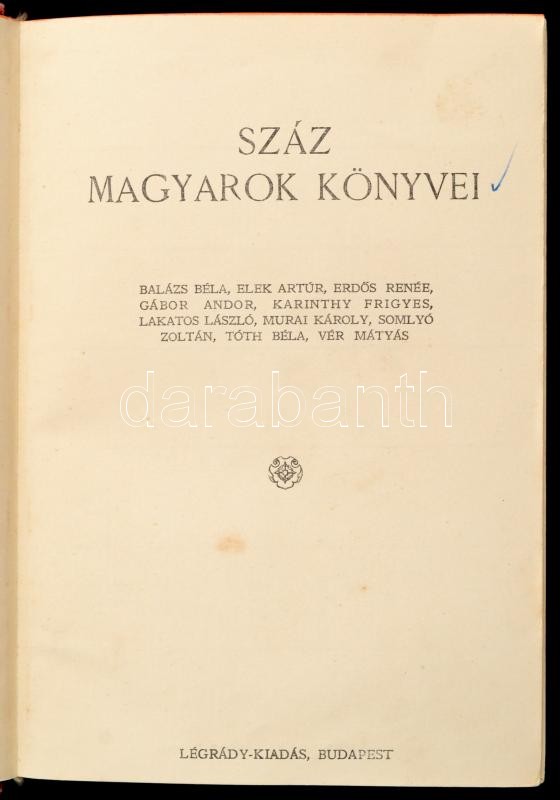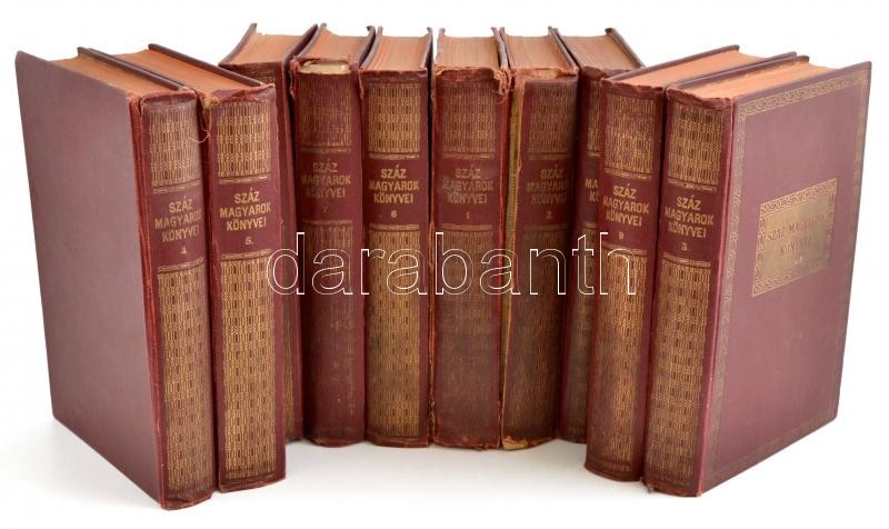 Száz Magyarok Könyvei 1-10. kötet. Ady Endre, Babits Mihály. Móricz Zsigmond, Csáth Géza, Kosztolányi Dezső, Gárdonyi Géza, Jókai Mór, Mikszáth Kálmán, Balázs Béla, és mások írásaival. Bp., é.n., Légrády-Kiadás. A könyvekben szereplő szerzők kartonra kasírozott portréfotóival, aláírásuk fakszimiléjével. Kiadói aranyozott gerincű félvászon-kötésben, kissé kopott borítókkal, laza fűzésekkel, négy kötet gerincén kisebb-nagyobb sérülésekkel, egy portrén sérüléssel, egy másik portrén szakadással.
