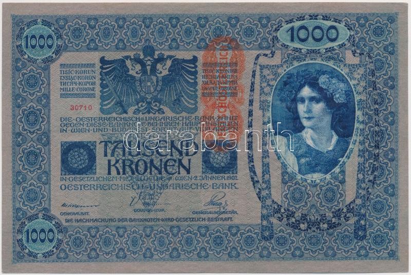1902. 1000K függőleges "Deutschösterreich" felülbélyegzéssel, mindkét oldala német T:I